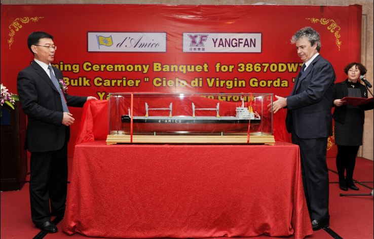 圖為:d‘Amico 集團(tuán)首席執(zhí)行官Cesare d'Amico 和揚帆集團(tuán)董事長、總裁李明東在命名午宴上為船模揭幕。